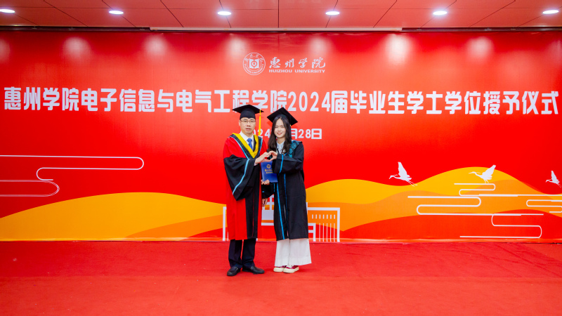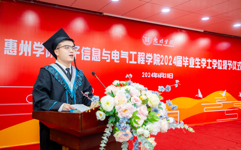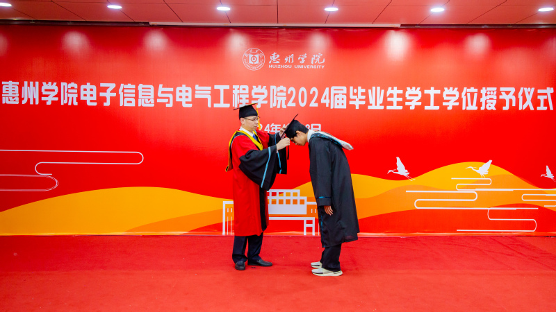 副院长徐德明宣读《惠州学院关于授予2024届普通高等教育全日制本科毕业生学士学位的决定》,学院483名毕业生获得学士学位。院长龙达峰为毕业生授予学位、扶正流苏,毕业生们与院长合影留念。