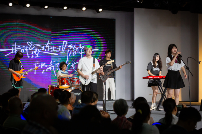 仪式开始前,于芳老师、温小琳、姚淳怀、廖义华等同学及顶楼乐队为师生倾情演绎了《离别开出花》《起风了》《凤凰花开的路口》《鲜花》等曲目,营造了热烈而又温馨的仪式氛围。