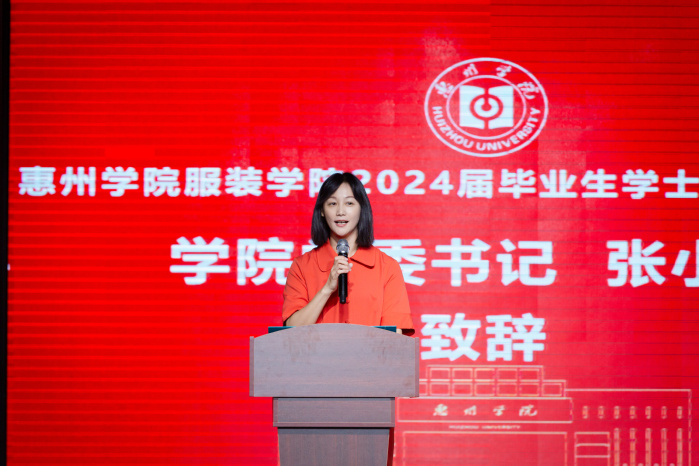暖场活动结束后,学士学位授予仪式在庄严的国歌中正式开始。院党委书记张小琨代表学院致辞。她向顺利完成学业的毕业生们表示热烈的祝贺,并对四年来一直陪伴、培养学生的家长们、教师们表达了敬意。张小琨书记寄语毕业生们继续保持学习的热情,不断提升专业素养和综合能力,用设计和创意为服装行业贡献力量,为社会带来更多的美好和惊喜。