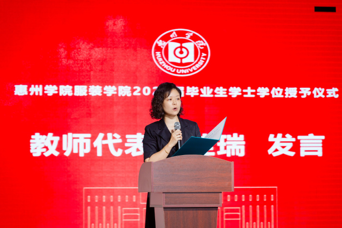 随后,教师代表、20服设2班班主任金佳瑞老师发言,她希望同学们在毕业的新起点上,立志明德,做一个有理想、有抱负的人;勤于学,乐于学,做一个终身学习、享受阅读的人;希望同学们平衡好工作与生活的关系,保持身心健康,乐观积极面对未来挑战。