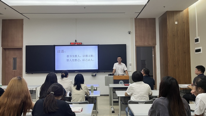 惠州中学张春达老师作题为“立德立教,以已示人”的讲座。他深入阐述了教师职业的神圣使命,详细解读了教师“十不准”的规范,分享了部分教学工作案例,强调教师注重品德修养,追求卓越。他深情寄语:“教书先教人,以德立教;塑人先塑己,以己示人。”