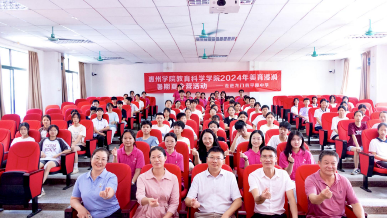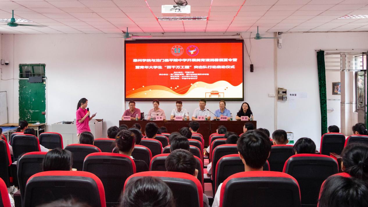本网讯 7月8日,我校在龙门县平陵中学举行2024年美育浸润暑假夏令营暨青年大学生“百千万工程”突击队行动启动仪式。龙门县教育局艺术专干刘伟华、龙门县平陵中学校长方慧、副校长钟伟平、惠州学院教务部副部长罗浩、惠州学院教育科学学院指导老师罗晓敏老师、李航老师、实践团队成员及全体夏令营学员参加了启动仪式。