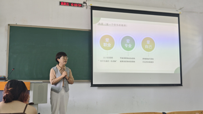 讲座最后,胡文君老师认为新时代的老师还需要做一名懂“道”的教师,具有“统筹”的发展观。学会思考、学会记录、学会归纳可以让自己得到更快的成长。胡文君老师以“一辈子做老师,一辈子学做老师”结束了本次讲座的所有内容,并给予了学生们美好的祝福,获得了在场学生的热烈掌声。