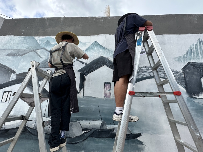 团队成员于7月27日抵达长龙村,在实地考察墙面情况后,分工合作、携手并进,逐步推进墙绘项目。在墙绘过程中,团队注重环保和细节处理,他们使用彩条布铺在地上防止颜料污染地面,采用保鲜膜、防尘膜等工具保护画面以防雨水冲刷。在村委领导、干部和村民们的热心帮助下,他们克服了天气、材料等难题,用将近一周的辛勤努力,共同完成了这一幅将近120平方米的大型作品。