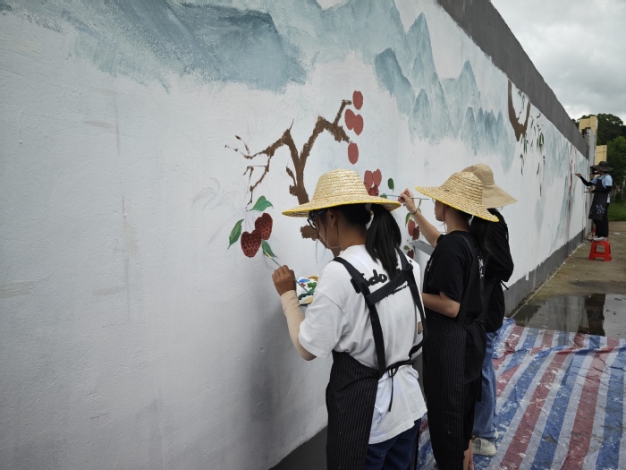 本网讯 近日,美术与设计学院“绘美乡村团队”在镇隆镇长龙村开展的暑期“三下乡”社会实践活动顺利结束,该团队经过前期与村干部的交流,确定了以地方产业特色为创作背景、以荔枝与山水房子为主题的墙绘草稿图,开展了一场墙绘美化行动。