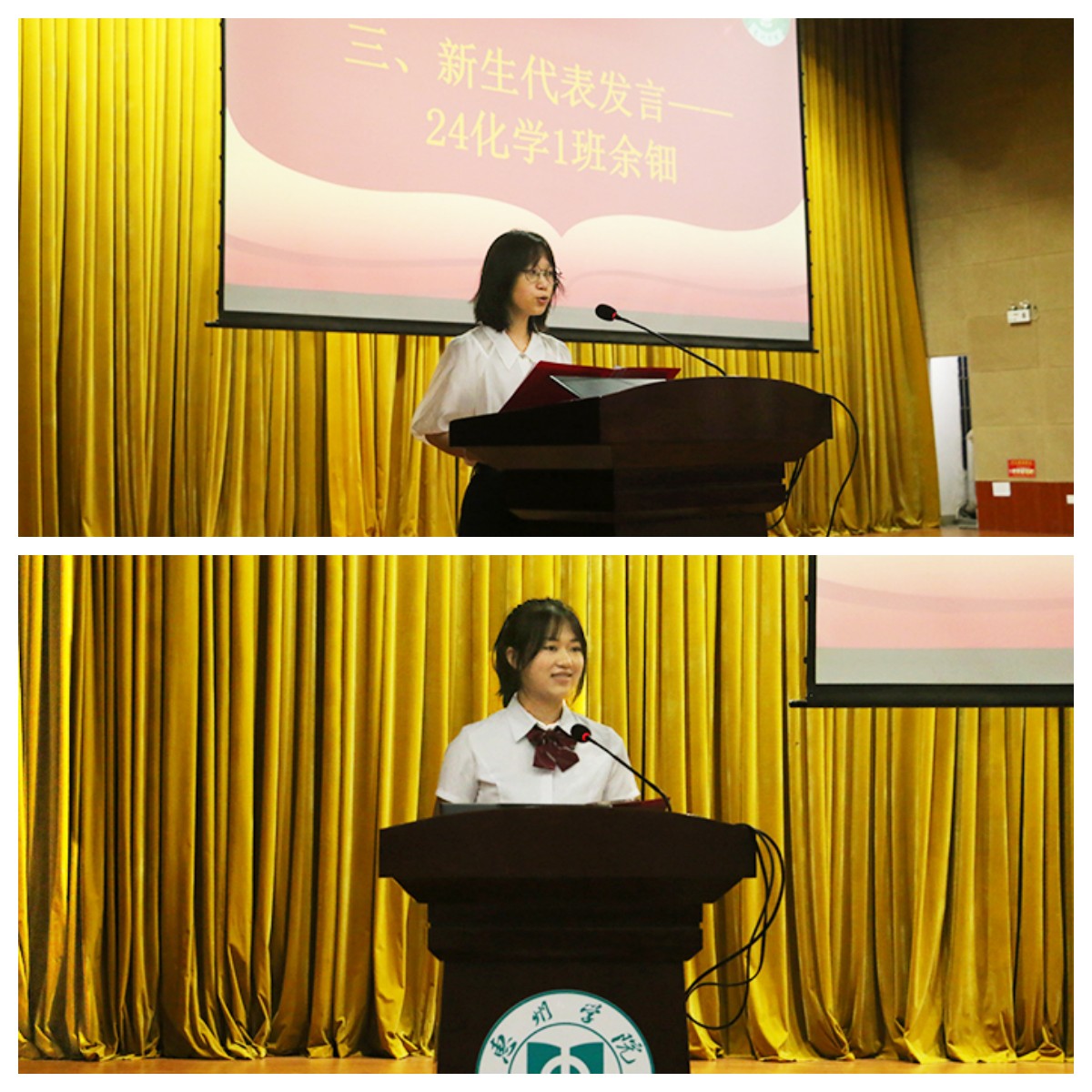 接着由新、老生代表依次发言。2024级化学1班的余钿同学以真挚的情感表达了对大学生活的期待与憧憬,鼓励同学们勇于挑战自我,积极拥抱大学生活。2022级应用化学2班张璇同学作为老生代表,分享了自己的学习经验和成长心得,为新生们提供了宝贵的建议。
