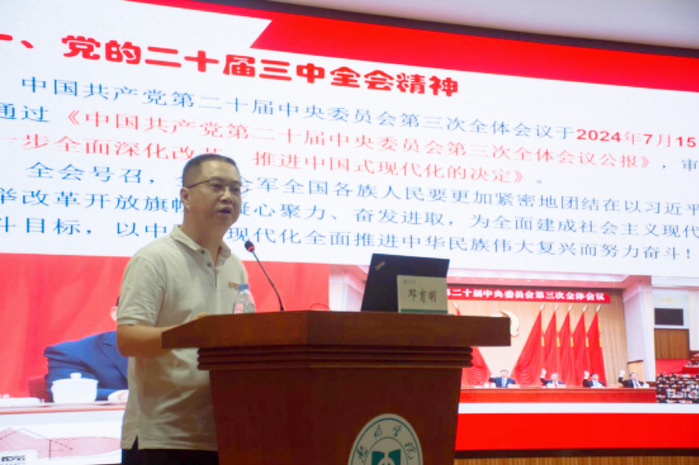 邓育明以“听党话 跟党走 争当新时代好青年——学习贯彻党的二十届三中全会精神”为题讲授“思政第一课”。首先,他阐述了党的二十届三中全会精神以及习近平总书记对青年的殷殷嘱托。他强调,青年理想远大、信念坚定,是一个国家、一个民族无坚不摧的前进动力。同学们要向革命先辈、有为青年和优秀榜样学习,志存高远、冲锋在前、扎根基层、脚踏实地,做有理想、敢担当、能吃苦、肯奋斗的新时代好青年。