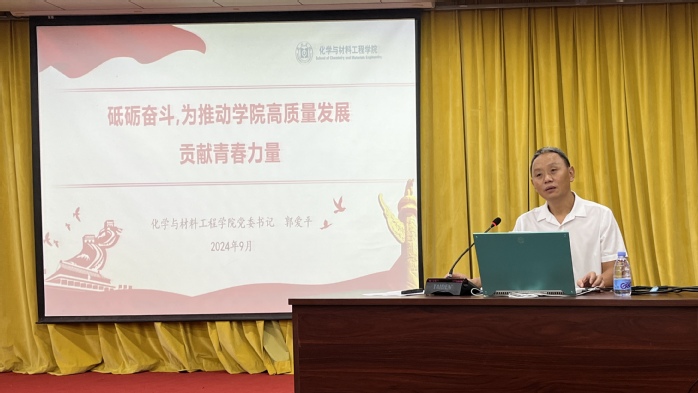 本网讯 为推动学院高质量发展,增进新生对学院发展建设的了解,化学与材料工程学院于9月12日在图书馆报告厅开展2024级新生开学第一课。课程由院党委书记郭爱平、院长封科军主讲,学院2024级全体新生参与学习。