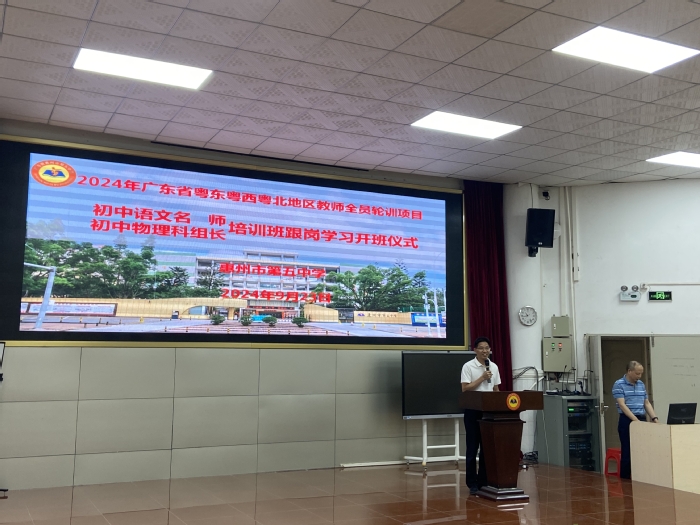 开班仪式上,叶均对此次两个培训班的学员老师来校跟岗学习交流表示热烈的欢迎,并介绍了惠州市第五中学的基本情况。他表示,五中对此次物理、语文跟岗培训作了详细安排和精心的准备,希望各位学员老师在跟岗学习期间互相学习,互相成就,共同推动教育教学高质量发展。