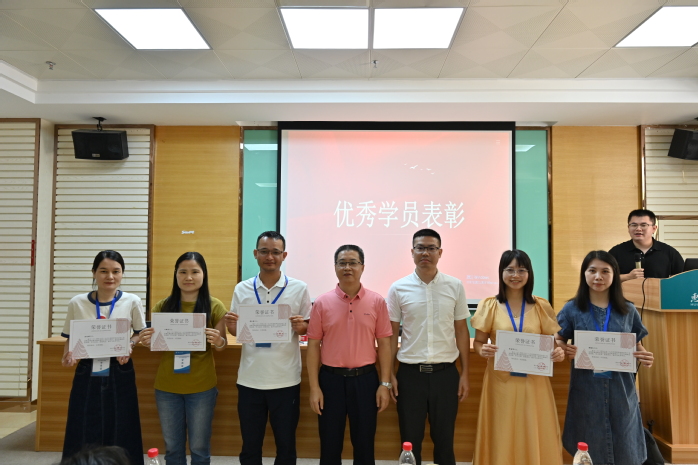 邓育明、朱云共同为获奖学员颁发了证书。博罗县龙溪第二中学的李文峰作为学员代表上台发言。他代表全体学员对美术与设计学院的精心组织和细致安排表示感谢。随着,李文峰带着全体学员共同回忆了培训的点滴精彩时刻,也重点分享了学员们在本次培训中的收获。他表示,将会把培训所学到的知识和技能应用到实际工作中,助推惠州基础教育的高质量发展。