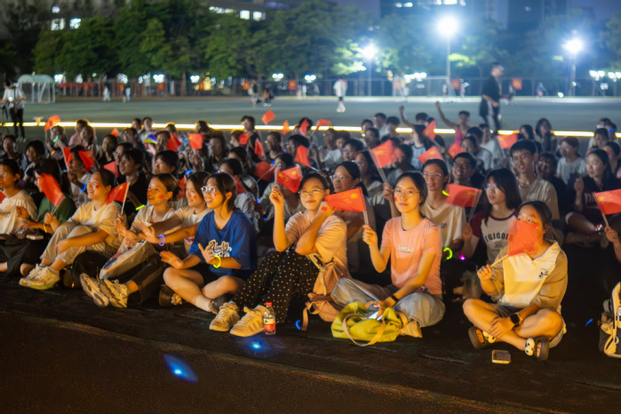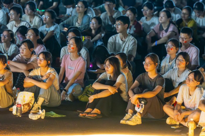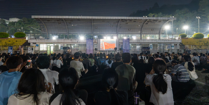 当天展映电影《我和我的祖国》在学校田径场举行,吸引了近千人观影。影片是一部深沉的充满爱国情怀之作,讲述了不同历史背景下七个触动心灵的感人故事,同学们聚精会神观影,深受感动。