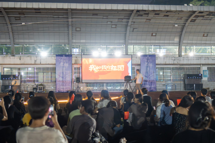 当天晚上,展映电影《我和我的祖国》在学校田径场举行,吸引了近千人观影。影片是一部深沉的充满爱国情怀之作,讲述了不同历史背景下七个触动心灵的感人故事,同学们聚精会神观影,深受感动。