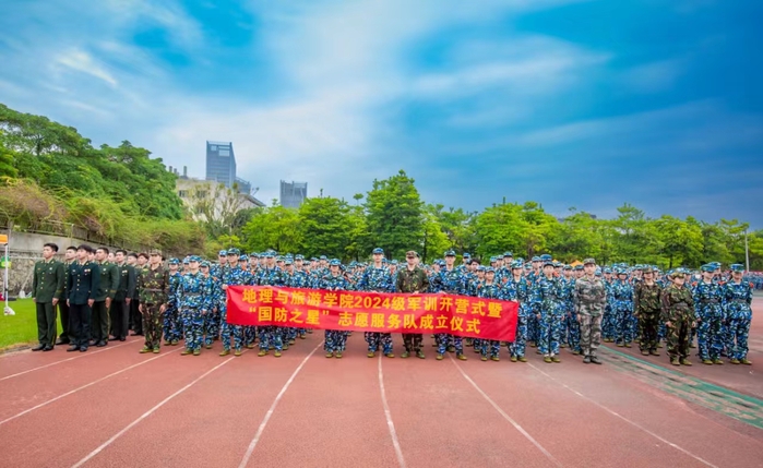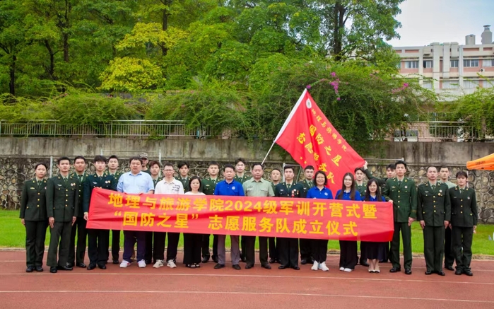 本网讯 为发挥军人“退役不褪色”精神,引导退役复学大学生们积极投身志愿服务活动,2024年10月9日上午,地理与旅游学院在田径场新生军训开营式上举行“国防之星”志愿服务队成立仪式。校武装部部长姜如照、地理与旅游学院党委书记李富明、党委副书记祝琳、辅导员刁佩珍、杨宇及2024级班主任王丰年、尹辉、陈丽萍出席活动。