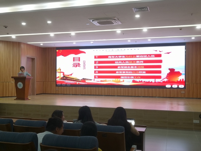 会上,孙山山老师对当前的征兵政策、入伍条件、选拔程序以及退役后的相关待遇等信息进行详细解读。通过生动的案例和详实的数据,向同学们展示了参军入伍的广阔前景和优惠政策,进一步激发了学生们参军报国的热情。