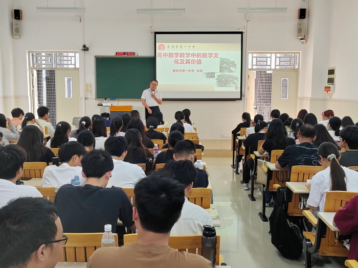 本网讯 2024年10月11日下午,我院邀请惠州市第一中学数学科组长余军老师为2022级数学与应用数学专业学生作名为“高中数学教学中的数学文化及其价值”的专题讲座。本次活动由惠州学院教务处主办、数学与统计学院承办,讲座由沈威老师主持。