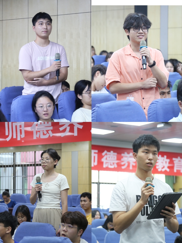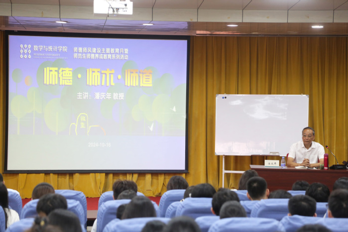 潘庆年教授以“师德·师术·师道”为主题,结合新时代弘扬教育家精神要求和数学专业特点,以及个人四十多年从教经历,向在座师生讲解了教师职业道德、师范生专业学习、技能提升和文化传承等方面的知识。他鼓励青年教师要不畏艰难,在备课、上课等环节下足功夫,学会上课并“站稳讲台”,坚持以德立身,在言传身教中引导学生行为正确,关爱学生、团结同事,做好职业规划,重视教学方法的改革,持之以恒做好教学科研工作,平衡好教学与科研、工作与生活及家庭之间的关系,和谐发展。同时,他鼓励在校的师范生,要学好专业课知识,特别是师范方向课程,加强实践锻炼,积极参加各类师范技能比赛活动,增加历史文化及数学文化书籍的阅读量,涵养数学思想文化,不断提升数学文化思维和综合素养,努力成长为德智体美劳全面发展的新时代大学生,为成为“四有”好老师作充分准备。