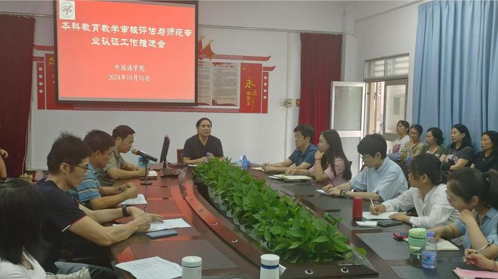 本网讯 为深入学习贯彻党的二十届三中全会精神,推进本科教育教学评审与师范认证工作,促进外国语学院高质量发展,10月16日下午,副校长刘国栋应邀参加本科教育教学审核评估与师范专业认证工作推进会。会议由外国语学院党委书记田华文主持,全院教职工参加推进会。
