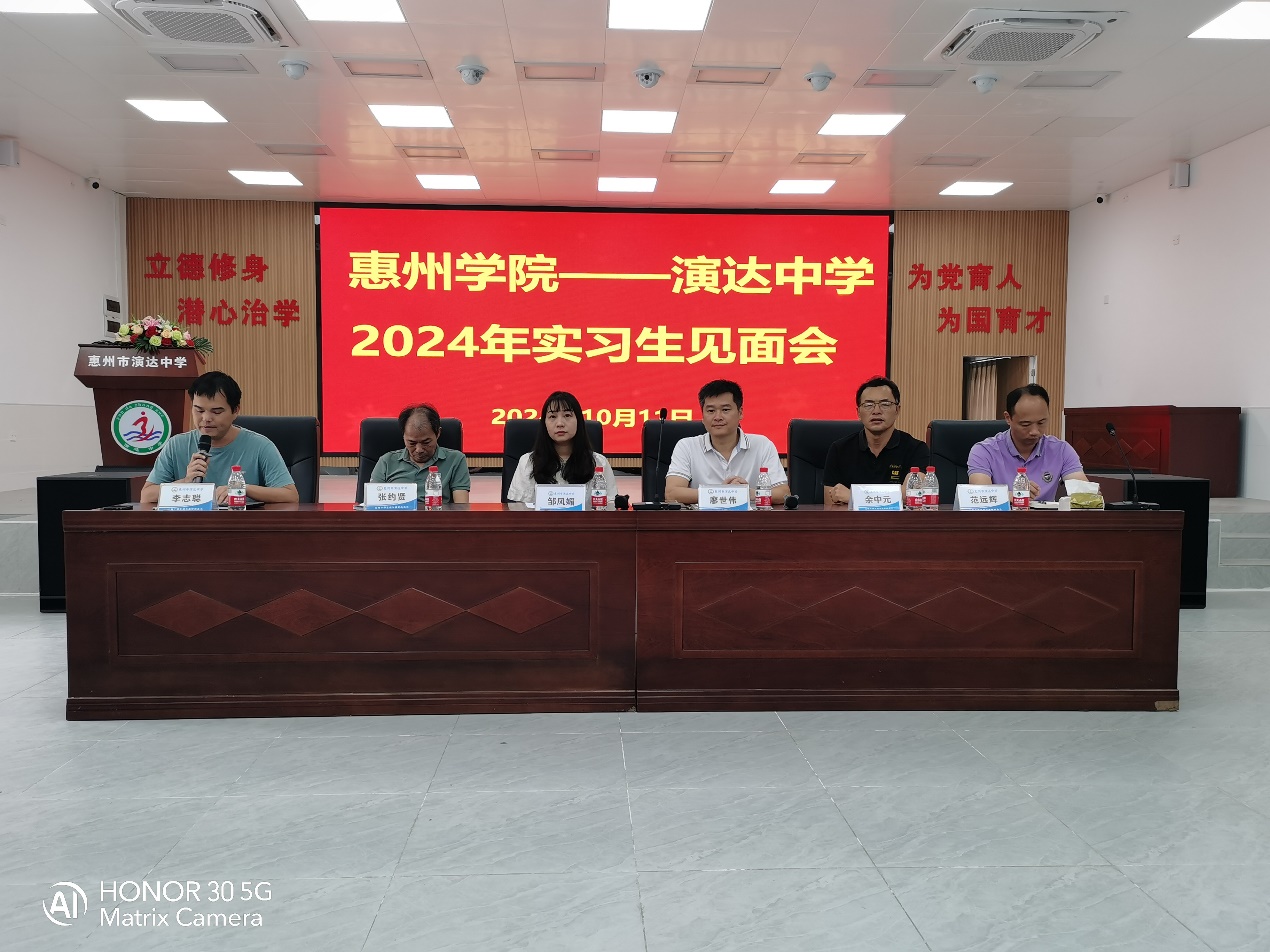 廖世伟在致辞中对惠州学院实习学生表示欢迎和寄予厚望,并对上届实习工作进行了总结和对优秀指导教师进行表彰,演达中学各职能部门就实习生具体事宜进行了部署。余中元教授在会上强调,实习实践是中学基础教育与高校高等教育合作交流的纽带,是师范生成长和职业发展的关键环节,师范生应结合毕业论文、师范技能训练、中学事务将理论与实践结合,把所学专业知识和教学技能应用于实践,在实践中创新,把先进教学理念进行传播和践行。实习实践是加强产学研结合、理论与实践结合,促进高等教育与基础教育融合育人,改进中学教学提升中学教师素养的重要途径;对高校、师范生和中学是三赢举措。