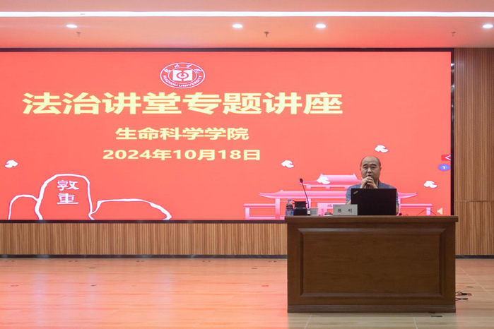 本网讯 为深入推进法治社会建设,切实增强大学生的法治意识,进一步弘扬和宣传法治教育。10月18日晚,生命科学学院在旭日科技大楼A座201会议室举办2024级新生“法治讲堂”专题讲座。本次讲座邀请我校总法律顾问、政法学院法学专任教师、资深律师、网红法律博主陈刚老师作为主讲嘉宾,2024级全体新生、辅导员罗水荣和李水琴老师参与活动。
