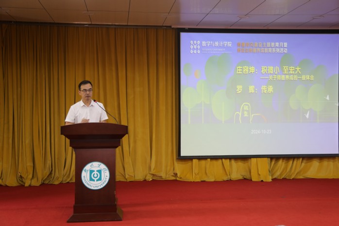 讲座上,罗辉副教授以“传承”为主题,分享了我院老一辈与新一代教师团队优良的工作作风和工作态度,以及努力向上、和谐共进的集体精神和深厚的教育情怀;向同学们介绍了个人成长和三十余年如一日的教师职业生涯,与同学们分享了教书育人心得体会,就师范生的师德养成及专业成长等进行了指导和鼓励,勉励同学们要传承好学院的优良传统,以优秀的老师和校友们为榜样,坚持终身学习,努力成长为一名“好老师”,做一名“有德、有志、有才、有为”的新时代青年。