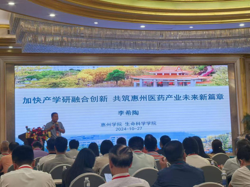 会上,李希陶长应邀作了“加快产学研融合创新 共筑惠州医药产业未来新篇章”的主题报告,介绍了我院的师资力量、办学条件,以及生命大健康产业学院和生物医药特色班的建设成果。同时,他还着重阐述了我院申办生物与医药专业硕士点的愿景,表达了学院致力于培养高层次、复合型人才,服务地方医药产业高质量发展的坚定决心。