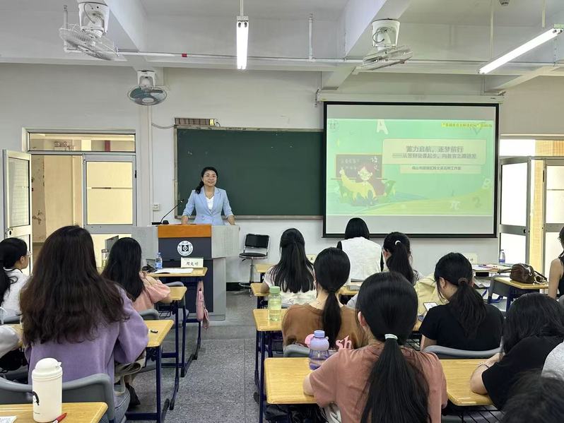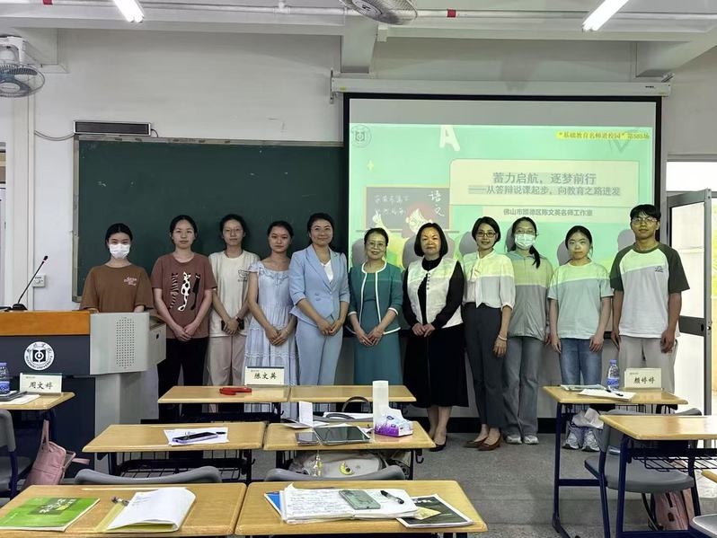本网讯 4月11日,我院在旭日楼411课室举行了“基础教育名师进校园”第585场活动。活动特邀佛山市顺德区容桂街道教育局陈文英教研员及其团队开展《蓄力启航,逐梦前行——从答辩说课起步,向教育之路进发》的专题讲座。讲座由中文系副主任王凌主持,第十一届卓越语文教师班及师范专业60余名学生聆听了讲座。