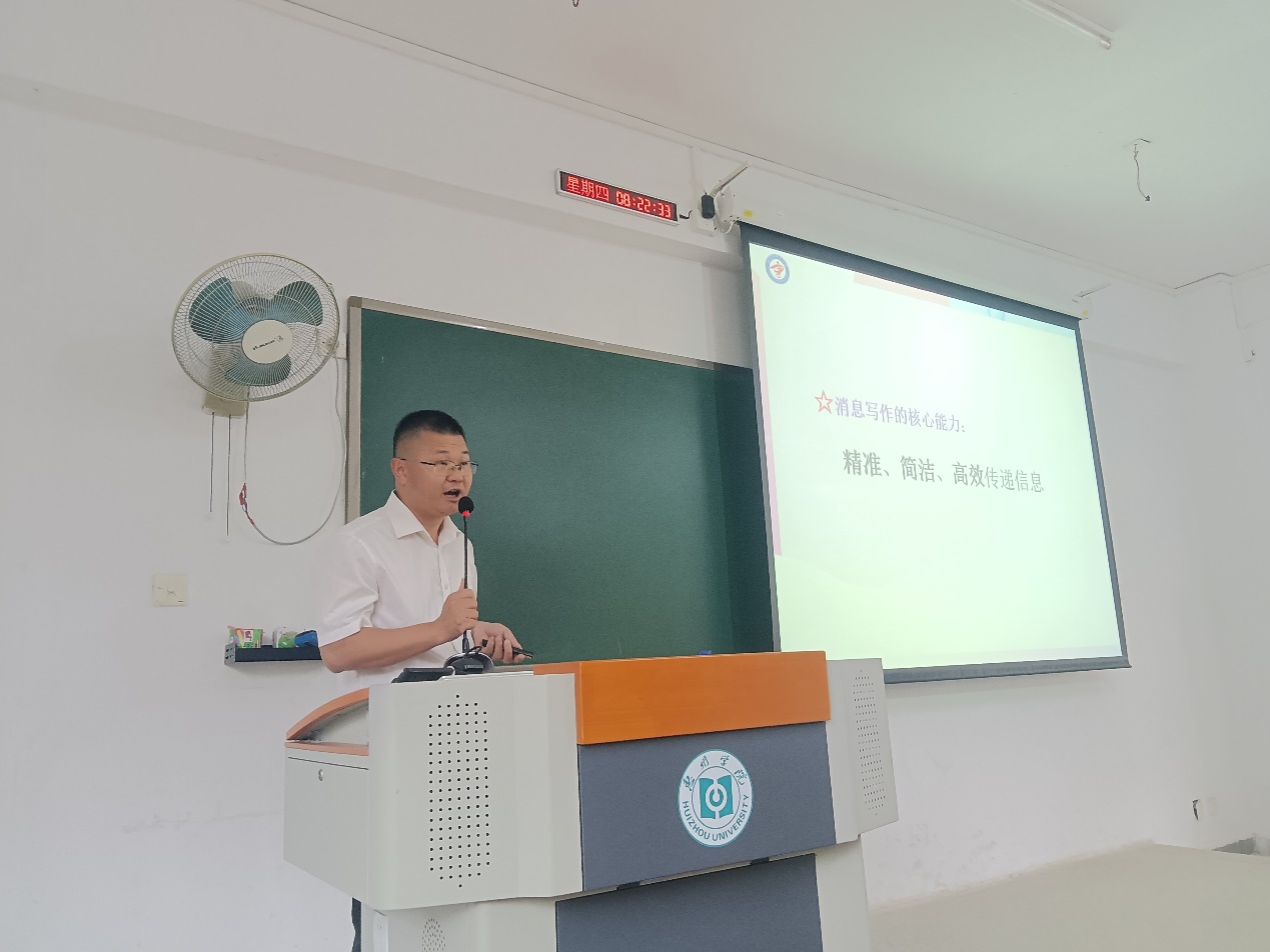 本网讯 5月8日,文学与传媒学院《基础写作2》课程在旭日416教室开展嵌入式教学,陆丰市甲子中学附属实验学校政教处主任、语文高级教师刘旭为24汉4班同学作《重构信息DNA:全媒体时代“秒传”新闻写法法则》的专场讲座。讲座由文学与传媒学院副教授闫占士主持。