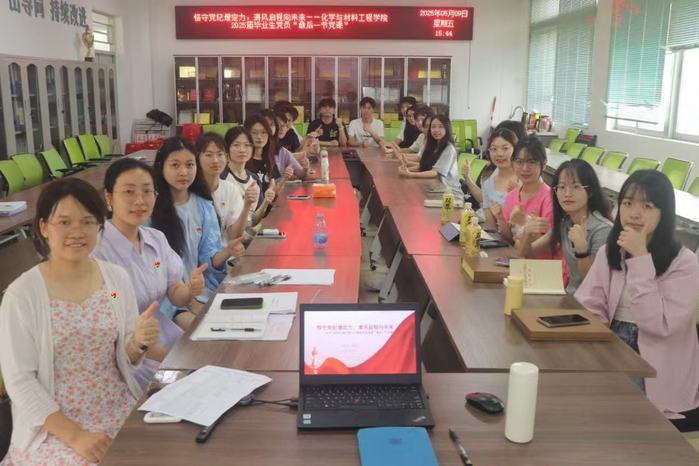 本网讯 为进一步强化毕业生党员的党性修养,激励他们在未来充分发挥先锋模范作用,5月9日下午,学院在化工楼E—503会议室开展2025届毕业生党员离校前“最后一节”党课。本次党课由院党委副书记廖淑珍主讲,学生辅导员刘敏及全体 2025届毕业生党员一起聆听了党课。