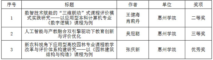 本网讯 近日,广东省教育厅公布2025年教育评价改革主题征文活动获奖名单。本次活动面向全省普通本科高校征集作品,共评选出一等奖12篇、二等奖17篇、三等奖20篇、优秀奖24篇。其中,我校选送的三篇论文表现突出:《数智技术赋能的 “三维联动” 式课程评价模式实践研究 —— 以应用型本科计算机专业 < 数字逻辑 > 课程为例》获二等奖,《人工智能与产教融合双引擎驱动下教育创新与评价优化》获三等奖,《新农科视角下应用型高校园林专业课程教学改革与评价体系构建研究 —— 以 < 园林建筑结构与构造 > 课程为例》获优秀奖。
