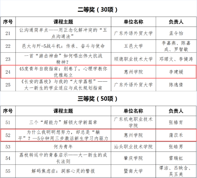 本网讯 近日,广东高校网络思想政治工作中心、广东高校易班发展中心公布了2025年度广东高校新生入学教育微课征集活动的评选结果。我校李建媛老师的作品《45度青年自救指南:别卷了,心理学教你优雅起立》荣获二等奖、蒲苡禾老师的作品《为什么我明明想努力,却总是“躺平”?——5分钟用三步激活新生学习内驱力》荣获三等奖。