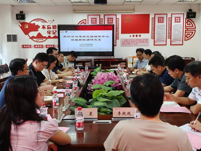 本网讯 10月10日,在“双百行动”驻惠阳区服务队的推动下,惠州学院与惠阳区融媒体中心产学研对接会在我校文学与传媒学院举行。惠阳区融媒体中心主任、台长钟蓝梅携惠阳区融媒体中心主编部、新闻部、电视节目部、专题部等部门负责人来访我校,与文学与传媒学院共同举行产学研对接会。我校文学与传媒学院党委书记马锦雄、院长陈梦,网络与新媒体专业专任教师以及“双百行动”驻惠阳区服务队副队长梁吉平等代表参会。