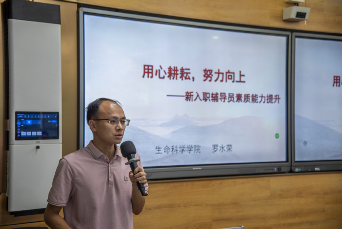 在经验分享环节,荣获2022年“广东高校辅导员年度人物”提名奖的生命科学学院辅导员罗水荣以《用心耕耘,努力向上》为题,结合自身工作经历分享工作经验。他从如何尽快熟悉工作、如何开展日常工作、如何提升个人素质能力等多个维度,为新进辅导员业务素质提升和职业发展传经送宝。讲座中既有真实案例的剖析,也有工作方法的提炼,语言朴实、案例生动,为新进辅导员提供了宝贵的经验借鉴和思想启迪。