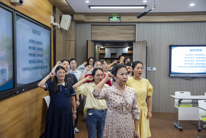 仪式在庄严的宣誓声中拉开帷幕。全体辅导员在学生工作部部长胡萍的领誓下,高举右拳郑重宣誓。铿锵有力的誓言展现出辅导员良好的精神面貌,表达了全体辅导员立德树人的坚定信念。