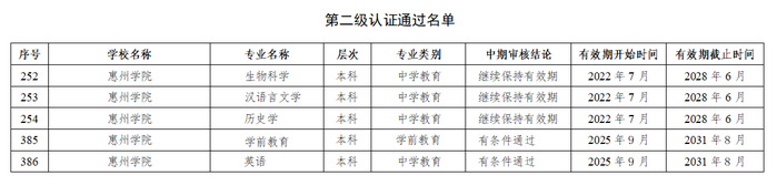 本网讯 近日,教育部办公厅发布《关于公布2025年通过普通高等学校师范类专业认证及认证中期审核专业名单的通知》(教师厅函〔2025〕18号),我校学前教育、英语2个专业通过教育部师范类专业第二级认证,认证结论有效期为2025年9月至2031年8月;汉语言文学、历史学、生物科学3个专业通过中期审核,继续保持有效期至2028年6月。