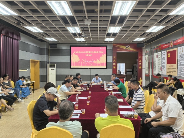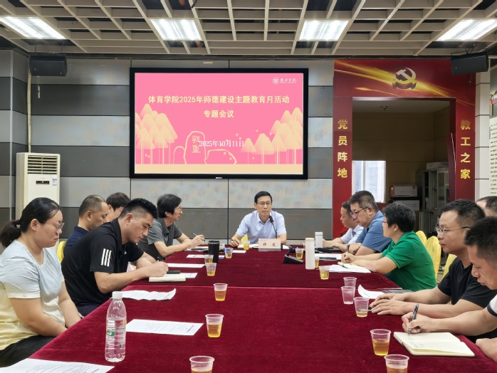 本网讯 2025年10月11日,体育学院在体育馆二楼党员活动中心召开2025年师德建设主题教育月活动专题会议。副校长郑文、学院班子成员、全体教职工参加会议,会议由院党委书记赖常青主持。