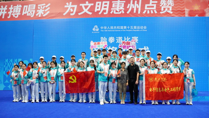 本网讯 近日,第十五届全国运动会跆拳道比赛在惠州体育馆圆满落幕。惠州学院电子信息与电气工程学院学生党支部党员志愿者化身“小海豚”,积极投身赛事志愿服务,凭借扎实的专业技能出色完成技术保障与服务工作,以实际行动诠释青年党员的责任担当。