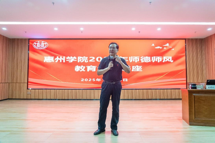 本网讯 为进一步深化师德师风建设,引导全体教师以教育家精神为引领,明晰育人使命、提升育人能力,组织开展好我校师德建设主题教育月各项活动,10月15日下午,我校在旭日科技大楼A座201报告厅举办2025年师德师风教育专题讲座,讲座特邀华南师范大学陈雄辉研究员作专题辅导。我校副校长郑文,党委教师工作部、组织部、宣传统战部、纪检监察室等部门负责人,行政教辅部门党支部代表,相关二级学院领导及专任教师代表共300余人参加。讲座由郑文主持。