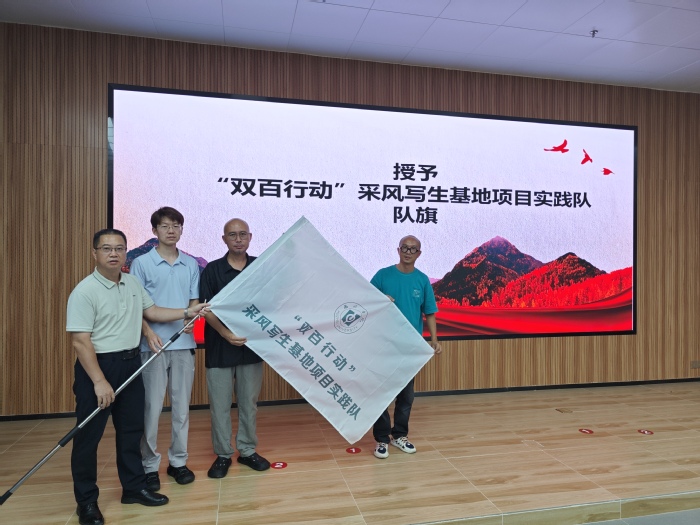 学院党委书记邓育明向实践队庄严授旗,标志着2025年“双百行动”采风写生基地项目正式启动。张一凡老师就基地建设的背景、目标与预期成果作了详细介绍。