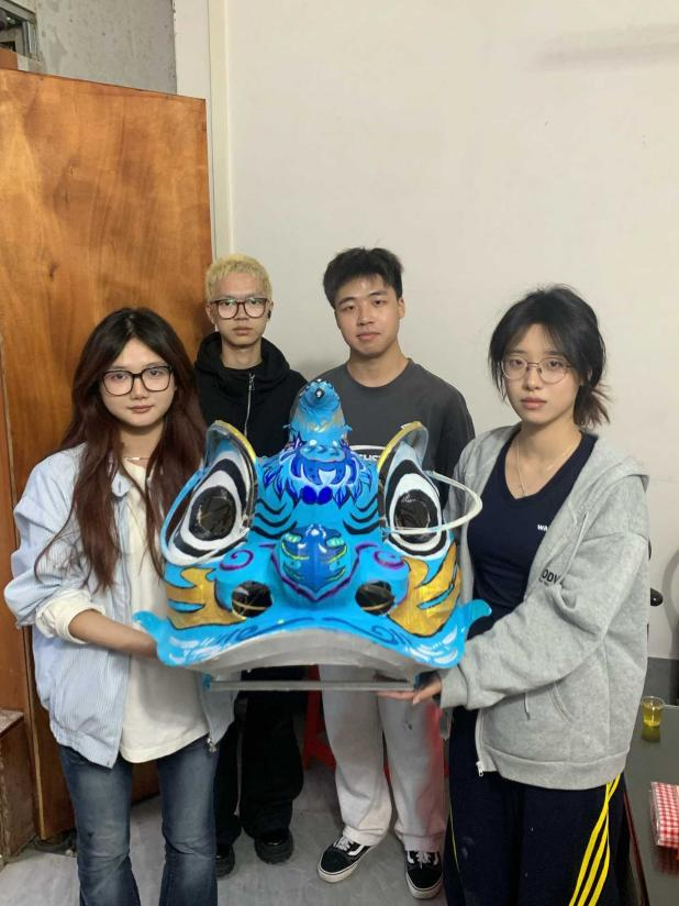 在狮头白模赋色环节,有的同学秉持传统理念,精心调红、黄等经典配色,尽显非遗文化的厚重底蕴;有的同学大胆突破传统框架,运用撞色设计、几何纹样等现代视觉元素,为狮头注入潮流气息,让传统非遗与当代设计理念碰撞出新颖火花。