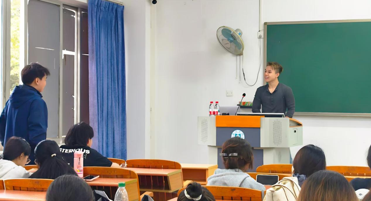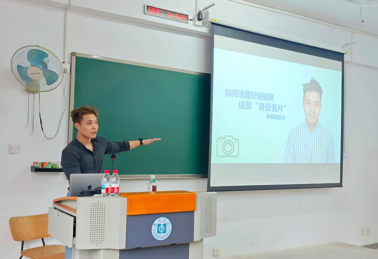 本网讯 10月28日,惠州杰艺文化公司总经理郑杰先生莅临我校,在旭日楼416课室为2024级网络与新媒体专业学生开展了《短视频创作》嵌入式课堂。他围绕“运营好短视频身份名片”这一主题,分享了短视频内容策划与制作的实战经验。