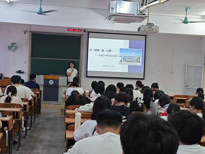 随后,杨琼以“从‘经师’到‘人师’”为题作专题讲座。她从四个核心维度展开,阐释“卓越教师”的内涵与标准,分析学校与教师发展的共生关系,梳理卓越化学教师成长的“三部曲”路径,并重申教育工作者的初心与使命。讲座尾声,杨琼以“师者化穹庐,退守星河之畔;少年逐天光,自掌日月罗盘”勉励学子,引发广泛共鸣。