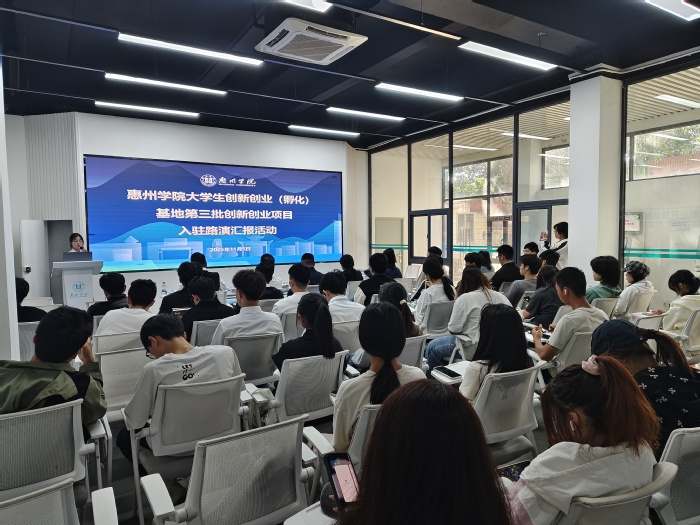 本网讯 为深化创新创业教育改革,推动学生创新创业项目落地孵化,切实提升学生创业实践能力,11月5日,创新创业学院于惠州学院大学生创新创业(孵化)基地举办了第三批创新创业项目入驻路演汇报活动。本次活动特邀惠州城市更新综合服务商李裕达先生、茄子智能科技CEO钟景威先生、创新创业学院院长史楠、经济管理学院副院长郭萍共同担任评审专家。16支创业团队同台竞技,各学院学生代表到场观摩学习。