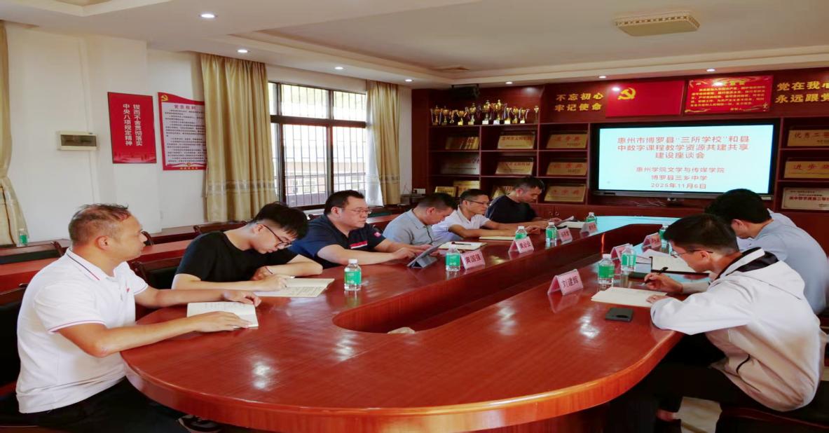 本网讯 为贯彻落实《惠州学院纵向帮扶惠州市欠发达地区“三所学校”和县中质量提升工作实施方案》,推进2025年数字课程教学资源共建共享专项帮扶工作,11月6日,文学与传媒学院党委副书记施少翰、现代技术中心主任卢庆武以及学院辅导员刘建辉一行前往博罗三乡中学,开展入校指导、培训回访及调研报告意见征求等工作。三乡中学校长黄必业、副校长黄国强、教导主任杨燕堂、廖伟添等校领导与骨干教师代表,以及惠州学院校友、参训教师代表共同参加活动。