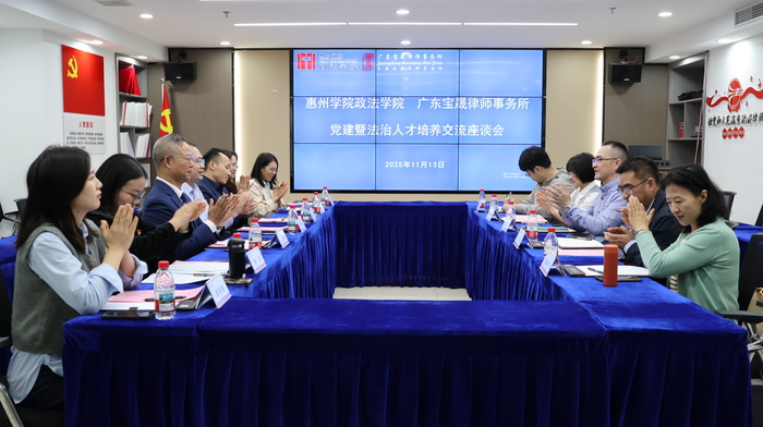 本网讯 11月13日上午,惠州学院政法学院与广东宝晟律师事务所党建暨法治人才培养交流座谈会在宝晟所会议室举行。政法学院党委书记曾蔚阳、党委副书记刘华,法律系主任黄明慧、教工第一党支部书记陈新华、辅导员陈曦,宝晟所主任黄伟粦、副主任江迪彪、高级合伙人刘家峰、党支部青年委员周莎、专职律师(惠州学院校友)尹舒君、潘静仪、陈明香、林润华等出席会议。