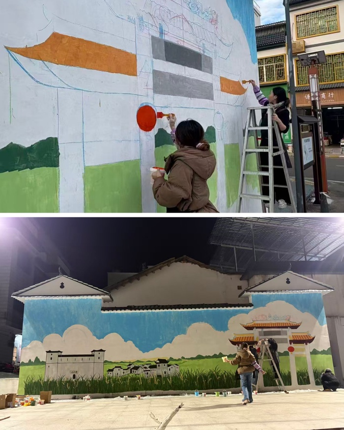 在创作进程中,团队克服了寒潮、雨天等恶劣天气的挑战,白天进行测量、打稿和上色工作,夜晚则专注于作品的优化,连续奋战了四个昼夜,最终创作出了一组既富有地方特色又充满时代气息的墙绘作品。这些作品不仅美化了村镇公共空间,更成为传播林寨古村文化的重要窗口。“这次实践让我们真正理解了艺术服务社会的意义。”参与创作的学生表示,“通过画笔将课堂所学应用于乡村振兴,是一次难忘的专业实践和思政教育。”