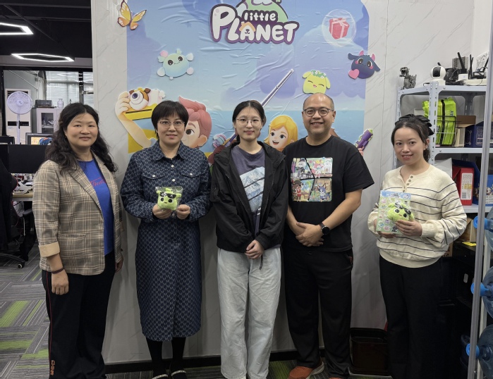 张晓欢一行首先亲切慰问了实习学生,随后与黄庄开展了深入沟通,了解了该公司的创办历程、主营业务、发展前景以及当前正在运营中的典型案例项目。黄庄表示,脑穿越科技有限公司作为深耕XR赛道10年的小型高新技术企业,目前已将数个相对成熟的项目推向市场,其中尤为出色的Little Planet(小小星球)VR游戏的全球注册用户已超10万,其周边纪念品也已与游戏一同上线。