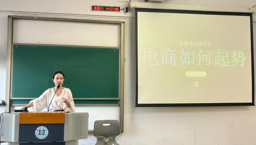 本网讯 11月15日,噗通新媒体科技有限公司联合创始人兼执行董事、我校传媒系优秀校友洪泽锦应邀回校园做专题讲座,此次她为2025级网络与新媒体专业新生带来了一场“电商如何起势”主题分享会。
