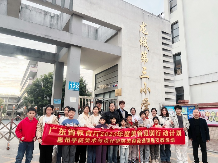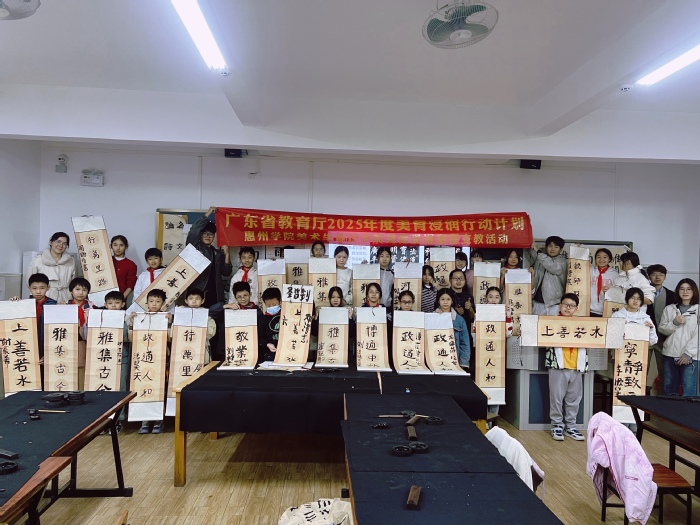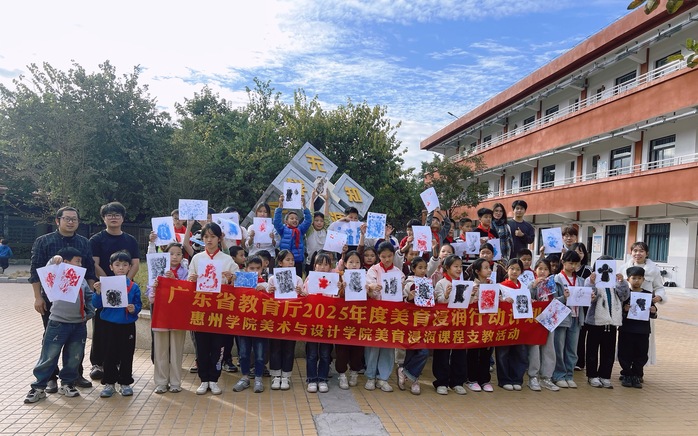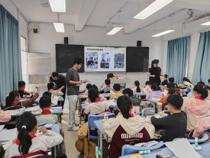 本网讯 11月20日,惠州学院美术与设计学院教师、广东省美育名师李帆工作室成员张一凡、黄燕进带领美术卓越教师班一行前往平陵中心小学、龙城第三小学开展美育浸润行动,分别在两所学校开展了“植物主题纸板版画”与“书法吉语训练”等特色美育课程。