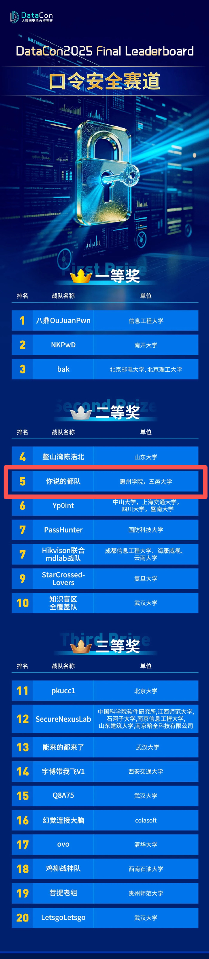 计算机科学与工程学院学子肖国金、黄明深、胡严松、祝振杰与五邑大学联合组建的“你说的都队”(指导老师:张丹、王萌、向训文),在口令安全赛道中表现突出,以全国第五名的优异成绩荣获二等奖,充分展现了学生在网络安全领域扎实的专业功底与创新实力。口令安全赛道聚焦口令猜测攻击这一当前突出的网络安全威胁。赛题要求参赛者从攻击者视角出发,攻克离线破解1000个虚拟账户、在线破解500个虚拟账户的双重挑战。选手需综合运用密码学知识、算法优化、深度学习及智能调度策略等专业技能,赛事全程对攻防实战能力进行了全面且严苛的考察。
