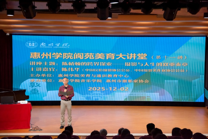 本网讯 12月2日晚,惠州学院阆苑美育大讲堂第十一讲如期开讲。本次讲座以“陈桥顿的跨界探索——摄影与人生的双重奏章”为主题,由惠州学院音乐学院党委书记曾裕林主持,知名摄影家陈伟华老师担任主讲人。活动由惠州学院美育与通识教育中心主办,惠州学院音乐学院、惠州市摄影家协会联合承办,惠州市摄影家协会主席陈竟辉等嘉宾及音乐学院等150多名师生、摄影爱好者齐聚现场,共享一场光影与人生交织的美育盛宴。